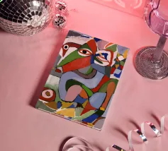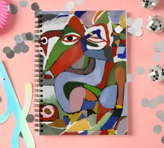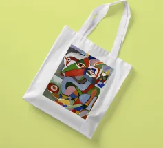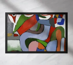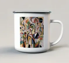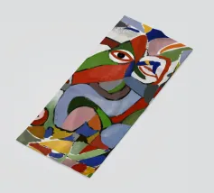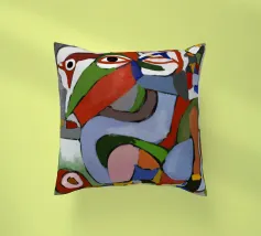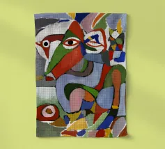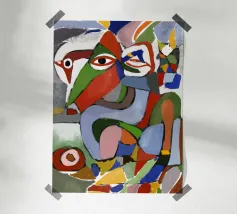 Una complessa composizione di forme astratte e colori vivaci crea un'esperienza visiva dinamica e frammentata. Volti e occhi si intravedono nel caos, suggerendo una rappresentazione di forme umane o animali in stile cubista.