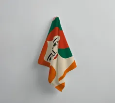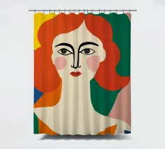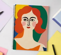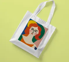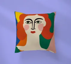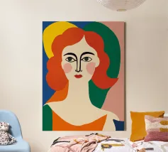 Un ritratto stilizzato presenta una donna dai tratti geometrici del viso e dai colori vivaci sullo sfondo. I suoi capelli rossi contrastano con le sfumature di verde, blu, giallo e rosa, creando un'atmosfera moderna e astratta.
