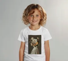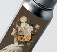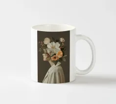 Ritratto collage di donna con capelli a fiori: questo ritratto minimalista raffigura una donna elegante di profilo laterale, con i capelli adornati ad arte da fiori colorati. Lo stile fashion boho è sottolineato dalle morbide tonalità della terra e da un'armoniosa tavolozza di colori con elementi beige e vintage retrò.