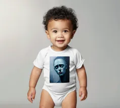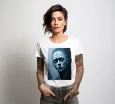 Una figura mostra un'espressione calma ma dolente, evidenziata dai toni pallidi della pelle e da una superficie strutturata. Lo sfondo scuro crea un contrasto sorprendente, esaltando l'atmosfera cupa.