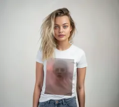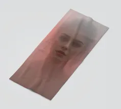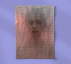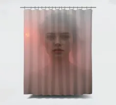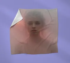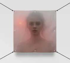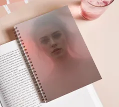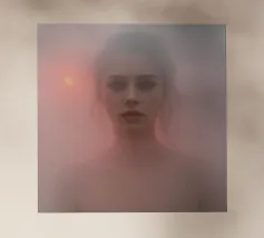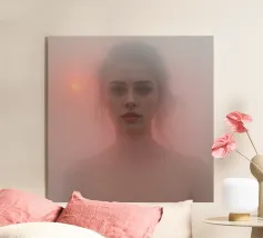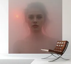 Una donna si erge con grazia nella nebbia, la sua espressione serena è dolcemente illuminata da un caldo bagliore del tramonto. La nebbia crea un'atmosfera onirica intorno a lei.