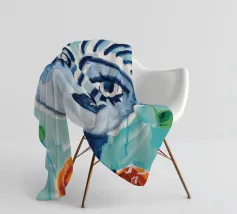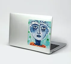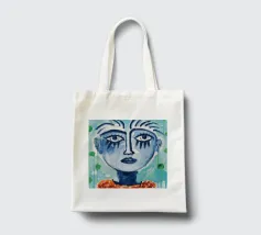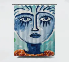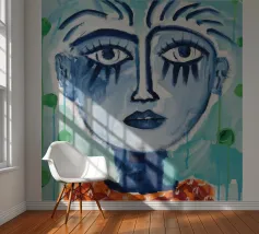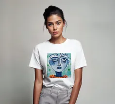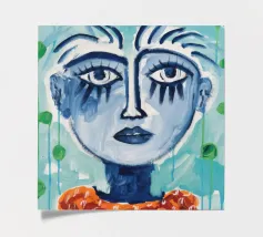 Questa opera d'arte raffigura un audace ritratto geometrico con linee decise e un mix di colori blu, bianco e nero. Lo sfondo è pieno di forme geometriche che contribuiscono al tema astratto generale.