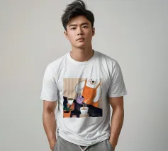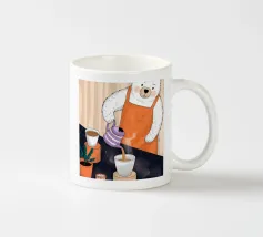 Un orso con un grembiule arancione versa il caffè in una tazza in una cucina rustica con una vegetazione lussureggiante. L'ambiente tranquillo celebra la gioia della semplicità mattutina.