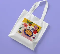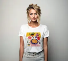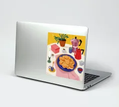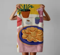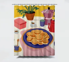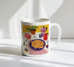 Una vivace natura morta di un tavolo da colazione con una caffettiera, tazze di caffè, un piatto di frittelle e una zuccheriera, raffigurata in uno stile audace e grafico con colori forti, che evoca un allegro rituale mattutino.