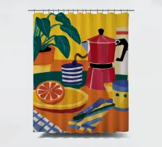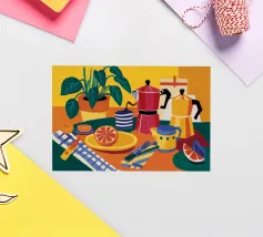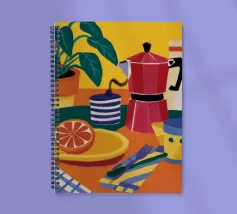 Una natura morta accogliente e invitante di un tavolo da colazione. Due moka rosse, una tazza di caffè e un piatto di pompelmo a fette sono disposti su una tovaglietta gialla su uno sfondo verde acqua, evocando un'allegra routine mattutina.