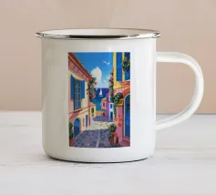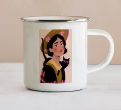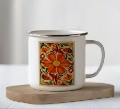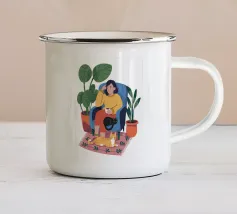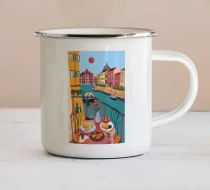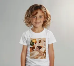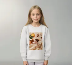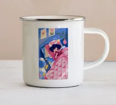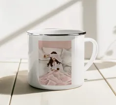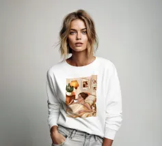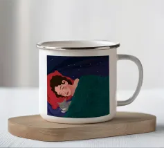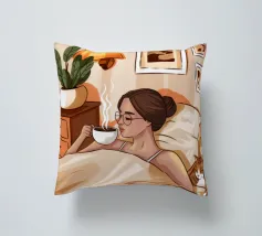 Una scena tranquilla che mostra una persona che si gode una tazza di caffè a letto. L'illuminazione calda di una lampada e le immagini incorniciate sullo sfondo evocano uno stato d'animo accogliente e tranquillo.