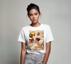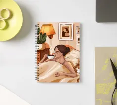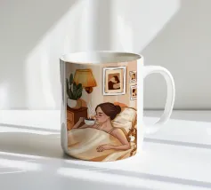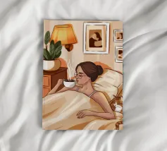 L'immagine mostra una persona che si gode una tazza di caffè fumante su uno sfondo rilassante di tonalità calde e morbidi motivi astratti, catturando l'essenza di un tranquillo rituale mattutino.