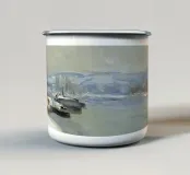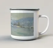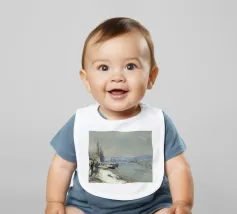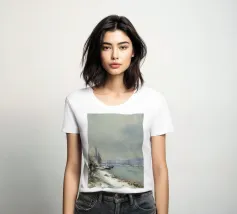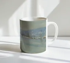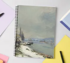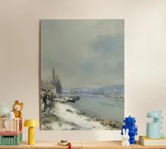 Questo tranquillo paesaggio invernale sulla riva del fiume mostra una passeggiata innevata con escursionisti, dolci colline e una distesa tranquilla sotto un luminoso cielo invernale. Le sottili sfumature di blu, grigio e bianco creano un'atmosfera invernale minimalista, piena di leggerezza e tranquillità. La scena combina un paesaggio fluviale in inverno, un'illustrazione naturalistica romantica, un'estetica invernale scandinava, un'arte paesaggistica senza tempo, una passeggiata in riva al mare sotto la neve e motivi naturalistici tranquilli. Ideale come murale invernale, arte da parete moderna, arredamento accogliente per la casa, decorazione naturale per il soggiorno, arte per gli amanti della natura.