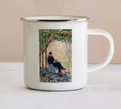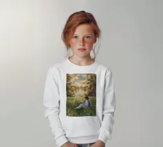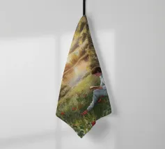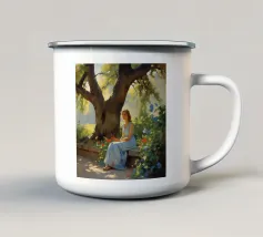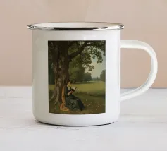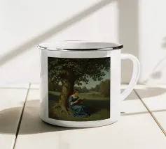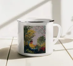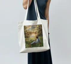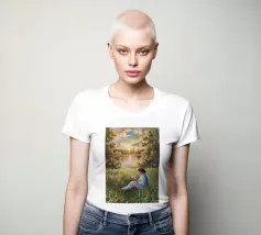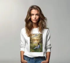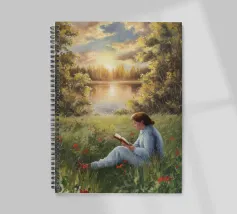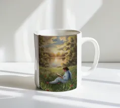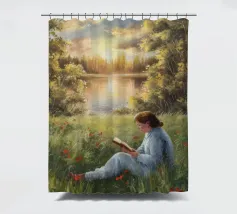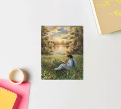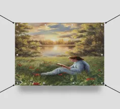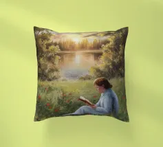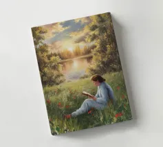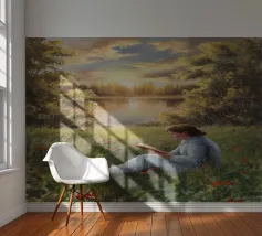 Una giovane donna giace su un prato lussureggiante in riva a un lago scintillante, immersa in una calda luce dorata. Papaveri vivaci ed erbe alte la circondano mentre legge tranquillamente, persa nel suo mondo sereno. Delicati raggi di luce filtrano attraverso gli alberi vicini, proiettando una luce soffusa sulla scena e riflettendosi sull'acqua tranquilla. Il dipinto evoca un senso di pacifica contemplazione e la magia senza tempo di un pomeriggio di sole nella natura.