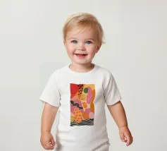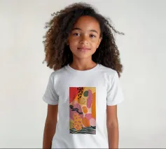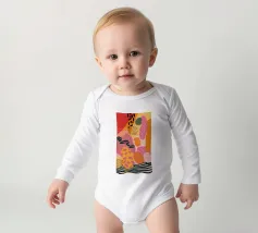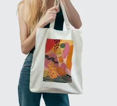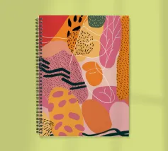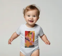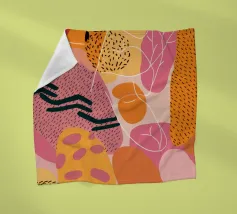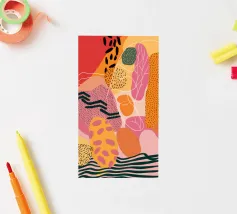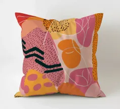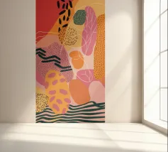 Una vibrante composizione astratta caratterizzata da un mix giocoso di forme organiche e geometriche con texture e motivi variegati. I colori dominanti sono i rossi, gli arancioni, i rosa e i gialli caldi, contrastati da accenti di verde scuro o verde acqua e nero. Le forme incorporano punti, trattini e linee ondulate, creando un effetto collage dinamico e moderno.