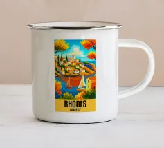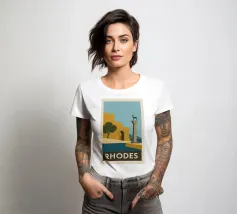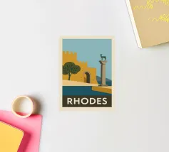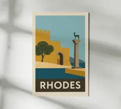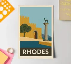 Con l'emblematica statua del cervo, le pareti ocra e il cielo blu brillante, questo poster cattura l'essenza di Rodi. Una città tra l'antichità e il Mediterraneo, presentata qui in uno stile solare e retrò. Un tocco di storia da appendere a casa vostra.