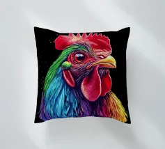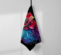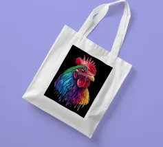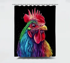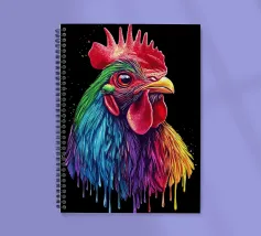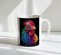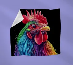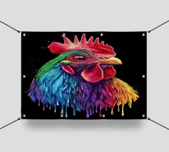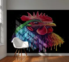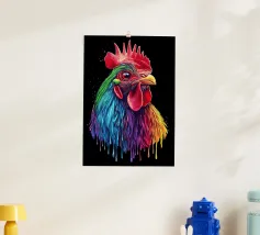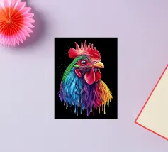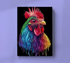 Un magnifico gallo ritratto, ispirato al "Red Rhodeländer", è raffigurato in un'impressionante rappresentazione ad alta intensità di colore. Il suo piumaggio passa dai toni rossi naturali a un vibrante spettro di blu, verde, viola, rosa, giallo e arancione, con un effetto liquido e gocciolante sulla punta delle piume. Lo sfondo è di un nero intenso, che esalta ulteriormente il brillante effetto cromatico. L'aspetto realistico dell'animale, unito al fantasioso gradiente di colori, crea un accattivante contrasto tra natura e creatività.