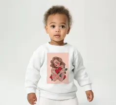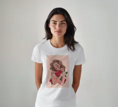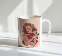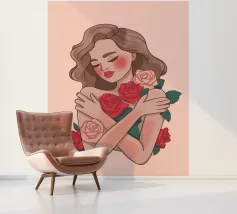 Un tenero ritratto di una persona che stringe al petto un bouquet di rose. La semplicità dello sfondo sottolinea l'intimità e le emozioni delicate del momento.