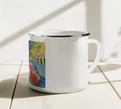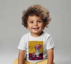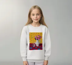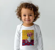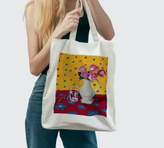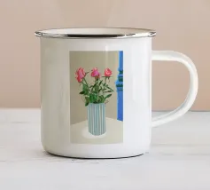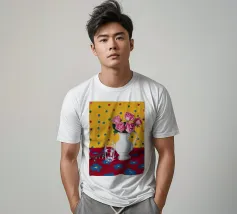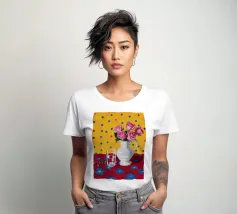 Un'allegra composizione di rose rosa in una semplice brocca bianca, su uno sfondo giallo brillante a pois colorati. Un singolo bicchiere d'acqua si trova vicino, creando una scena di pura e semplice gioia.
