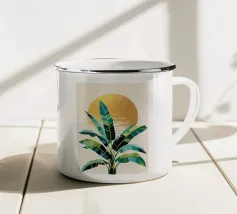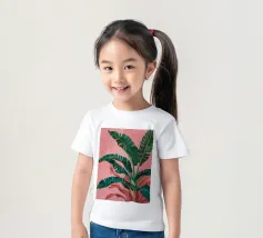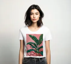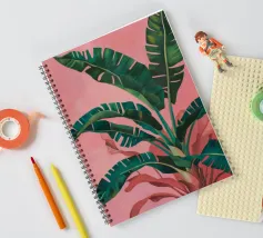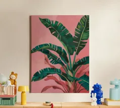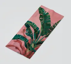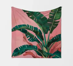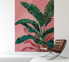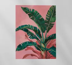 Un'illustrazione grafica e audace di grandi foglie di banano verdi su un vibrante sfondo rosa. La composizione è tropicale, moderna e ricca di stile energico e ad alto contrasto.