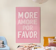 La scritta "More Amore Por Favor", stampata in grande, risplende nei colori rosa e rosa e dona un tocco italiano a qualsiasi stanza. Questo messaggio allegro e pieno di amore e buonumore invita a godersi la vita appieno!