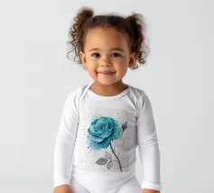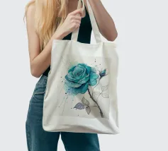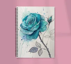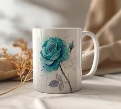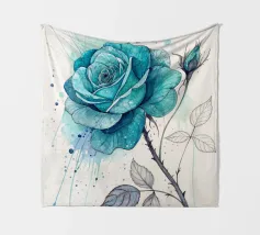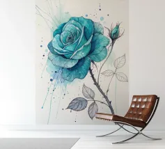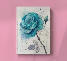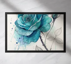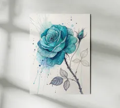 Una serena ed elegante rappresentazione ad acquerello di una vibrante rosa turchese in piena fioritura, completata da un delicato bocciolo di rosa. L'opera d'arte è caratterizzata da un'accattivante miscela di tonalità di verde scuro, acqua e indaco, con sottili schizzi e gocce che aggiungono un tocco moderno ed etereo. Perfetto per aggiungere un tocco di colore e di tranquillità della natura all'arredamento di qualsiasi casa o ufficio.