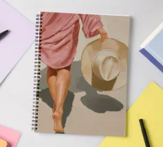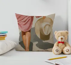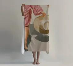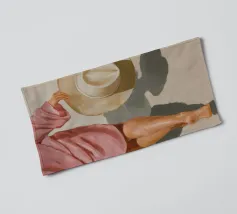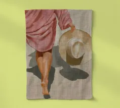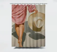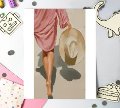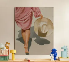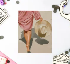 Un dipinto che si concentra sulla metà inferiore di una persona che indossa un fluente abito rosa, che si allontana e tiene in mano un cappello di paglia, evocando il senso di una piacevole passeggiata in un ambiente esterno soleggiato e leggermente nebuloso.