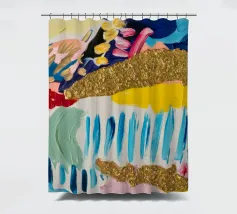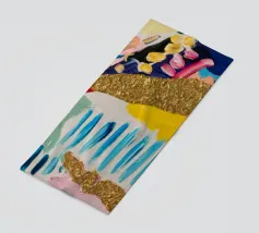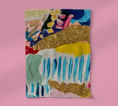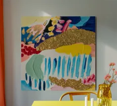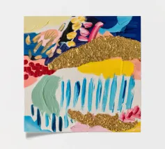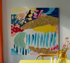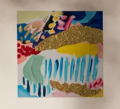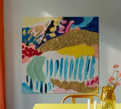 Blu freddo, rosa tenue, giallo e bianco dominano questo pezzo astratto, caratterizzato da linee verticali distinte create con l'impasto e flussi scintillanti di glitter oro.