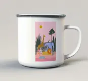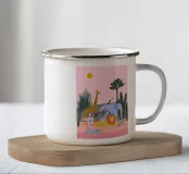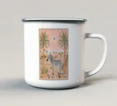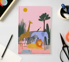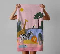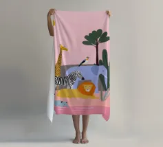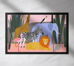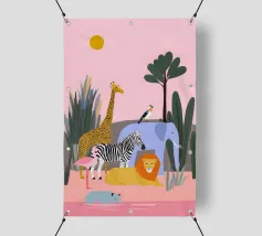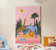 Un tranquillo safari con giraffa, zebra, leone, elefante, fenicottero e un piccolo vitello in riva al mare. Le forme pulite e i tenui colori pastello conferiscono un'atmosfera giocosa e moderna. Dolce per i bambini ed elegante per gli adulti.