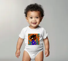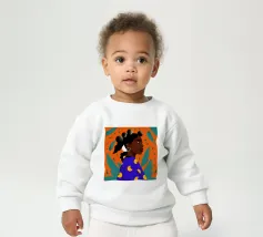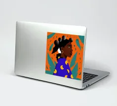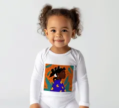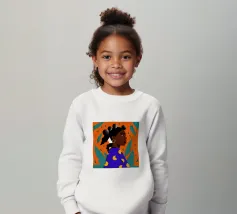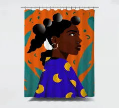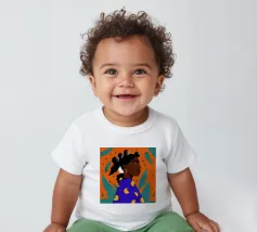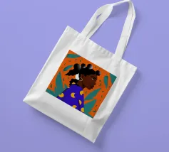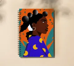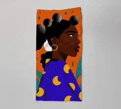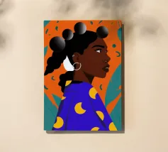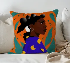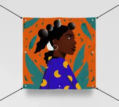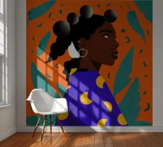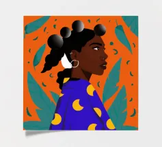 Un ritratto bello e sereno di una donna nera con i capelli raccolti a crocchia, che indossa grandi orecchini d'oro. Il caldo sfondo arancione e le foglie circostanti creano un'immagine potente e vibrante di forza tranquilla.