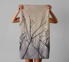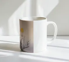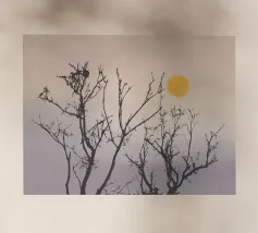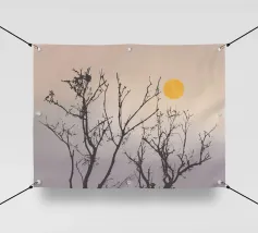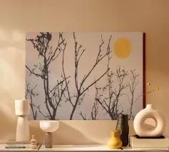 Alberi sagomati si stagliano su un cielo tenue e pastello, con il sole che proietta una calda luce dorata. Gli uccelli si posano tranquillamente sui rami, aggiungendo un tocco di vita alla scena serena.
