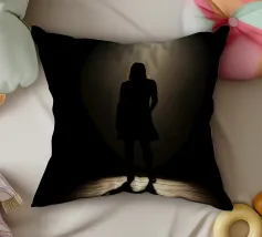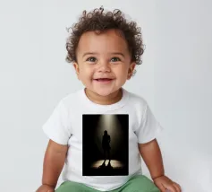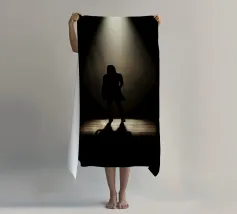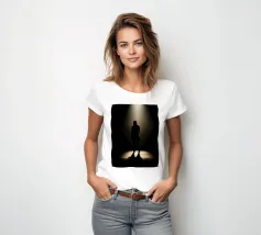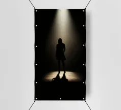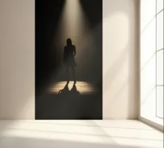 Una figura solitaria si staglia sotto un riflettore soffuso in uno spazio buio. L'ambiente mette in risalto la silhouette, proiettando ombre sul pavimento di legno ed evocando un senso di mistero.