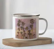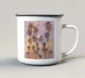 Un gruppo di palme alte e slanciate si staglia su un cielo sognante e colorato di rosa, viola e giallo, evocando un senso di calma e nostalgia tropicale.