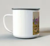 Alti e sottili cactus saguaro si ergono come sentinelle che dominano una valle, con lontane montagne cremisi sotto un vibrante cielo viola e blu, catturando un panorama desertico stilizzato e colorato.