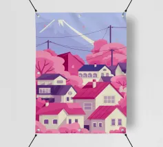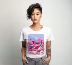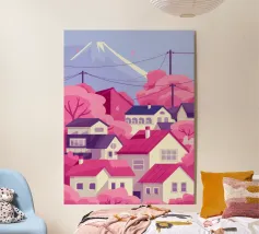 Una vibrante rappresentazione di un villaggio con le tradizionali case rosa, viola e bianche, annidato sotto una maestosa montagna innevata, probabilmente il Monte Fuji, con alberi di ciliegio in fiore in primo piano sotto un tenue cielo rosa.