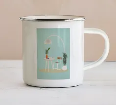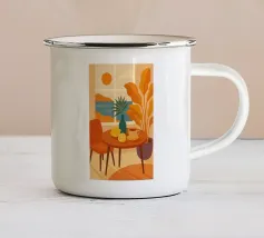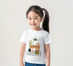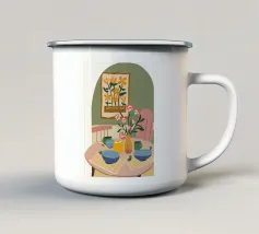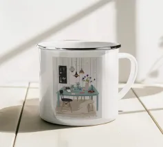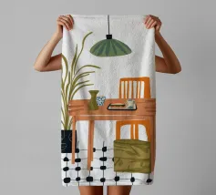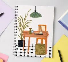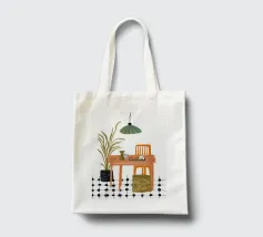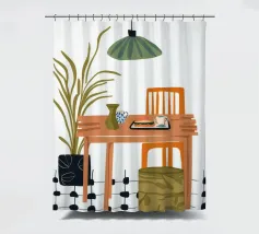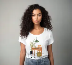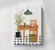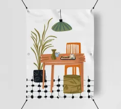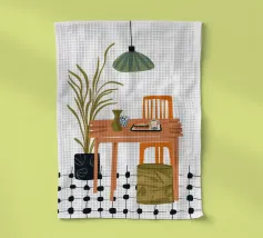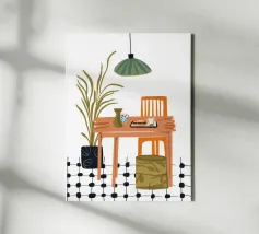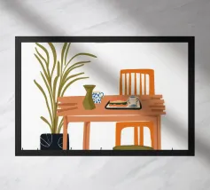 Una scena da pranzo chic e moderna con un tavolo e una sedia semplici su un pavimento a scacchi bianchi e neri. Una pianta in vaso e una lampada a sospensione completano questo interno elegante, minimalista e ben composto.