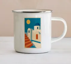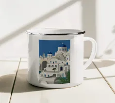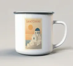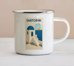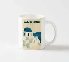 Poster retrò di Santorini, che celebra le sue famose cupole blu e le abbaglianti facciate bianche affacciate sul Mar Egeo. Una composizione pura che cattura l'eleganza e la luce delle Cicladi, perfetta per un arredamento mediterraneo chic.