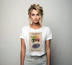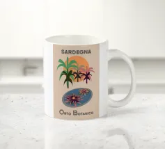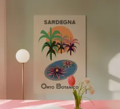 Questo poster artistico vi trasporta direttamente nel cuore della Sardegna, in un giardino botanico pieno di magia, calore e diversità mediterranea. La scritta "SARDEGNA" troneggia in alto in una tipografia decorativa ed elegante, incorniciata da palme colorate in ricche tonalità di verde, rosa tenue e viola vibrante.