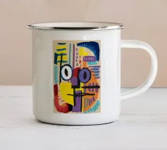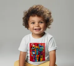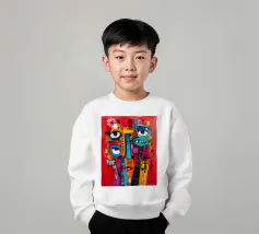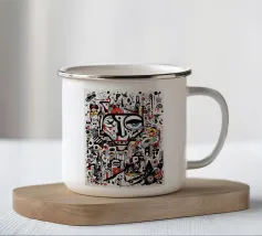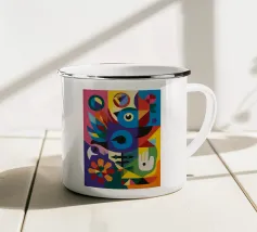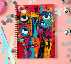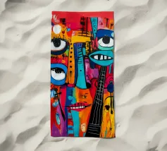 Un dipinto astratto audace e colorato con un volto surreale composto da occhi espressivi, tratti esagerati e strumenti musicali. Le pennellate dinamiche e la tavolozza vivida creano una composizione sorprendente ed energica.