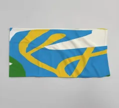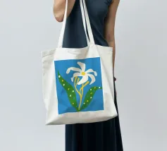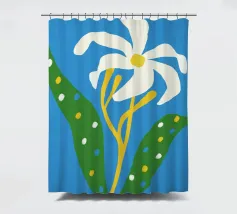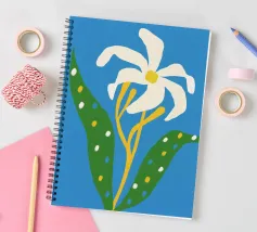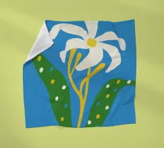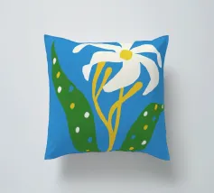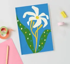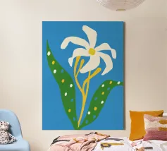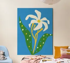 Un semplice fiore bianco con il centro giallo si staglia su uno sfondo blu brillante, con due foglie verdi ai lati ornate da puntini colorati. La composizione è minimalista, con colori decisi e linee pulite.