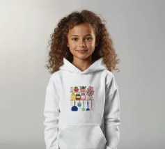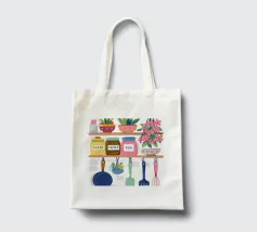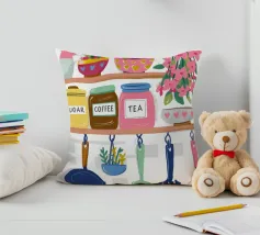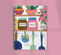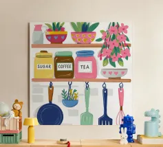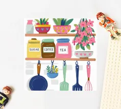 Illustrazione di uno scaffale da cucina ordinato con barattoli etichettati per lo zucchero, il caffè e il tè, utensili appesi e un vaso di fiori, che creano un'affascinante scena di cucina organizzata.