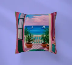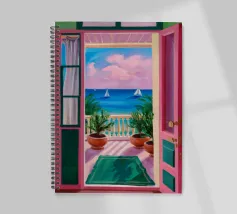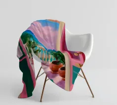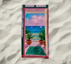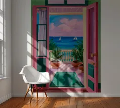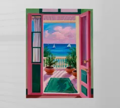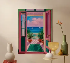 Illustrazione architettonica minimalista di una scala rosa che conduce a una porta ad arco, sullo sfondo di un cielo rosa con nuvole. La scena è serena, onirica e presenta una bella tranquillità surreale.