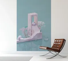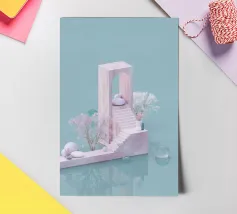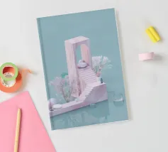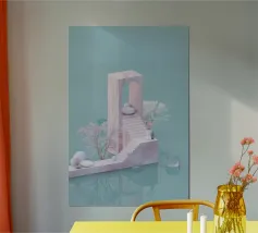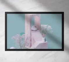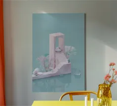 La scala, resa in delicate tonalità pastello - rosa, blu, giallo e lavanda - ha un aspetto surreale e invitante. Ogni gradino sembra fluttuare, fondendosi con uno sfondo tranquillo che evoca serenità e immaginazione. Il dipinto crea un senso di tranquillo movimento verso l'alto, come se conducesse lo spettatore verso una destinazione tranquilla e sconosciuta, immersa nel calore e nella calma.