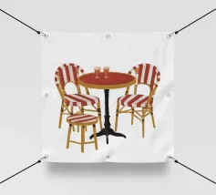 Un affascinante set da bistrot in stile parigino con tavolo rotondo rosso e due sedie in vimini con cuscini a righe rosse e bianche, isolate su uno sfondo bianco pulito per un look chic e minimalista.
