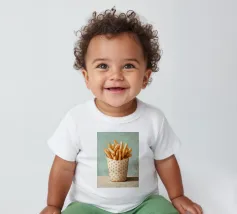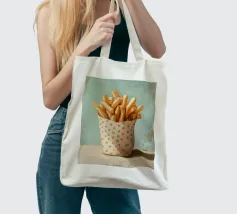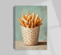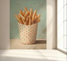 Un'illustrazione creativa di patatine fritte giallo oro in una scatola contenitore a puntini combina la cultura nostalgica del fast food con accenti moderni dai colori pastello e un design minimalista.