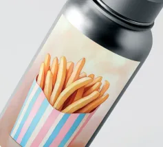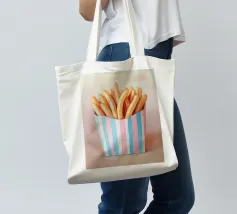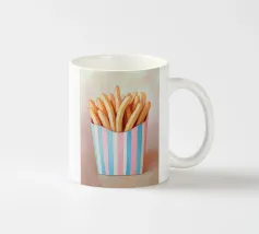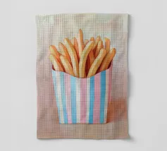 Questa affascinante illustrazione di patatine fritte in una scatola a strisce azzurre e rosa cattura il nostalgico look retrò del popolare snack. Con pennellate morbide e una tavolozza di colori armoniosa, l'opera trasmette una cultura alimentare giocosa e trasforma il fast food in arte culinaria creativa.