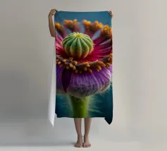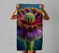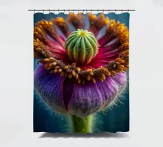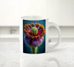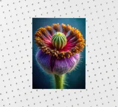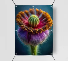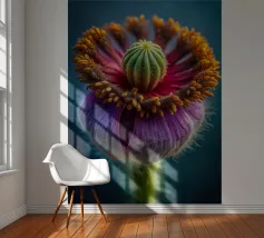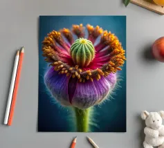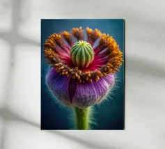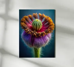 Una ripresa macro cattura i dettagli intricati di un fiore di papavero. Il fiore presenta petali viola, un centro rosso e un pistillo verde. Gli stami arancioni circondano il centro. Lo sfondo è di un blu scuro sfocato. L'immagine mette in evidenza le trame delicate e i colori vivaci del fiore.
