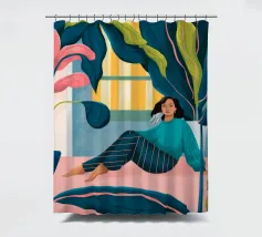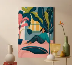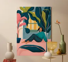Una persona è seduta su un pavimento rosa circondato da grandi piante da interno. La persona indossa una gonna a righe e un top nero.