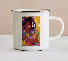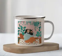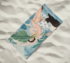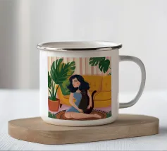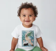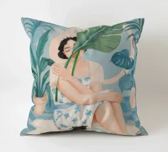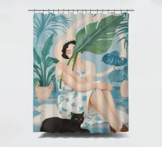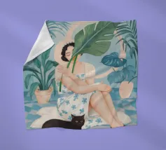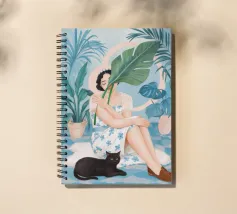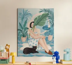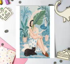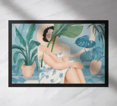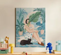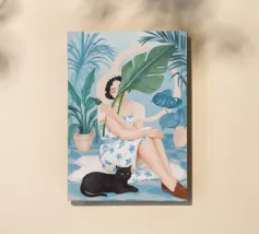 Il dipinto raffigura una persona seduta su una sedia, circondata da piante tropicali e da un gatto nero che giace nelle vicinanze. Lo sfondo è pieno di fogliame verde e di una parete azzurra.
