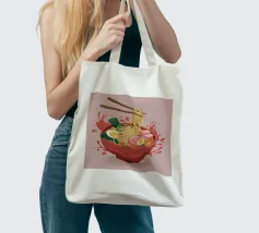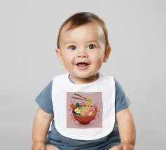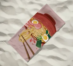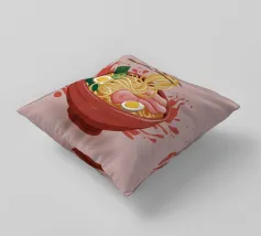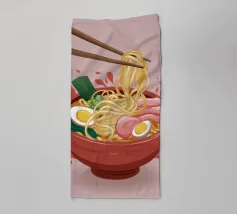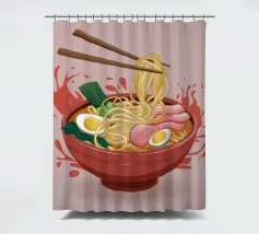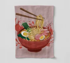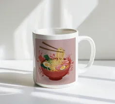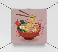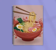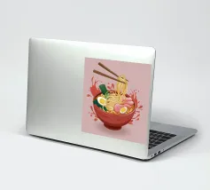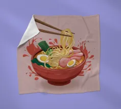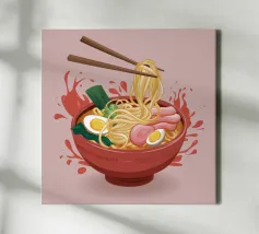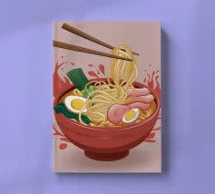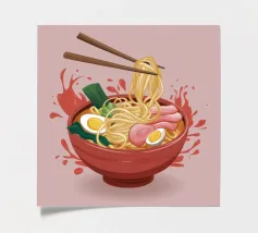 Un'illustrazione dinamica e piena di azione di una ciotola di ramen, con ingredienti che schizzano fuori, creando un senso di delizioso caos e movimento.