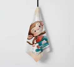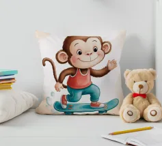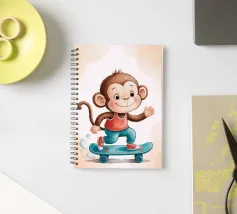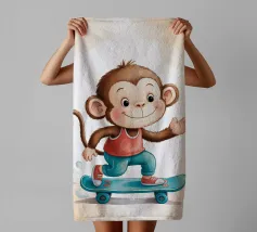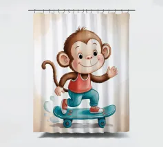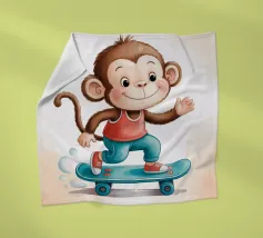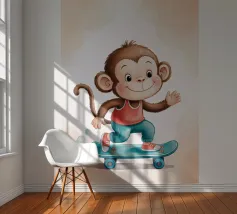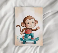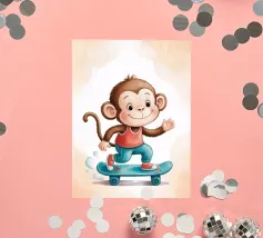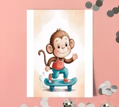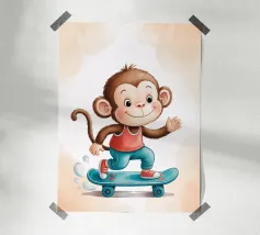 Un'allegra scimmietta saluta sul suo skateboard blu, vestita con una canotta rossa e scarpe da ginnastica abbinate. Questa illustrazione dinamica e piena di tenerezza è perfetta per la cameretta di un bambino o per un arredamento pieno di energia. Il disegno combina umorismo, movimento e un universo da cartone animato. Ideale per gli amanti degli animali carini e delle scene giocose, in uno stile moderno e colorato.