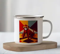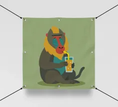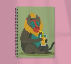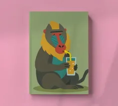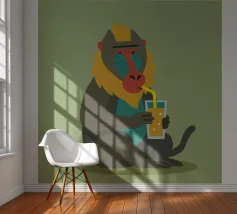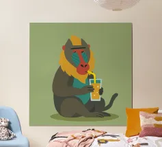 Un mandrillo colorato si rilassa e si gode un bicchiere di succo di frutta con la cannuccia: un motivo spiritoso e colorato per i bambini e per i disegni di ispirazione tropicale.