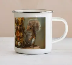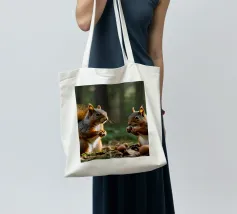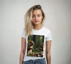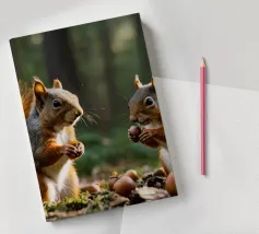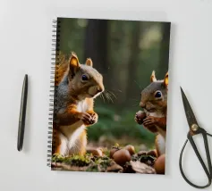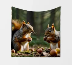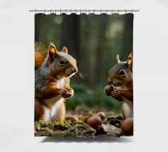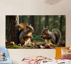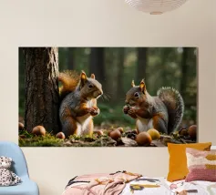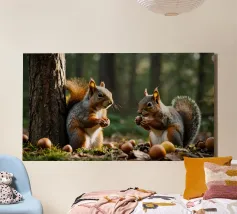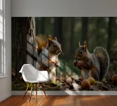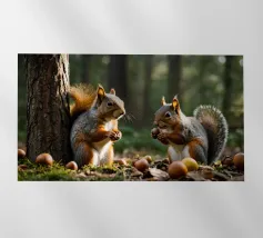 Due scoiattoli cercano ghiande sotto un albero in una tranquilla foresta. La luce del sole filtra attraverso le foglie, creando una serena atmosfera autunnale.