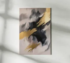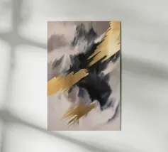 Furiosi colpi d'oro tagliano il taupe fumoso in un'esplosione di fuoco pittorico.