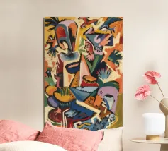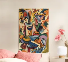 Le figure emergono dalla vegetazione colorata e dalle linee caotiche, evocando miti tribali e tumulti interiori.